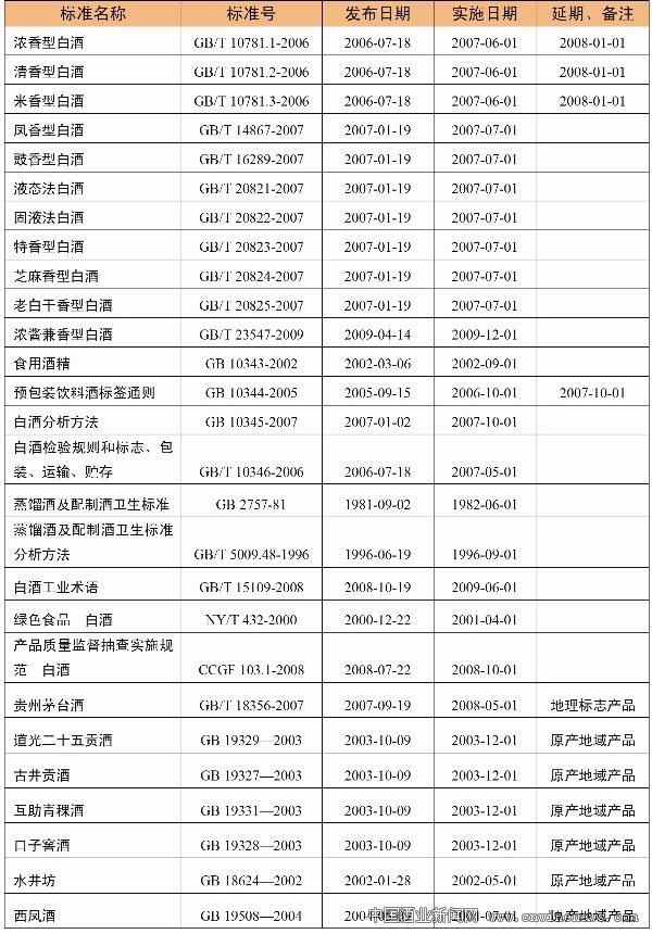 2004年,国家标准化管理委员会对现行国家标准加大了改革力度,进行了大规模清理整顿工作,将浓、清、米香型高低度白酒6项国家标准整合为3项国标;白酒分析方法15项国家标准整合为1项国标,到了2007年,各种香型白酒的国家标准基本完善(参见表1、表2)。