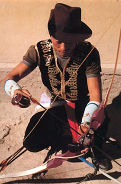 Arrow shooting is a traditional sports activity for Xibe people. When a boy is born, his family members would hang up a small bow tied by a red ribbon at the house gate. When he is five or six years old, he begins to learn to ride a horse and shoot arrows. In the past, bow and arrows were used as hunting tools and combating weapons. Now arrow shooting has been developed into a kind of sports event. On holidays, slack farming seasons or weekends, people might hold different kinds of arrow shooting events.