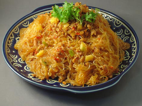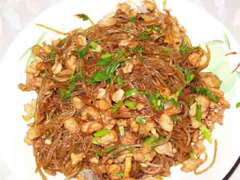 This fried dish is made from mung bean noodles (also known as bean thread noodles or Chinese vermicelli). These thin noodles don't need to boiled, just soaked in water, after which they become become soft and translucent. They make an interesting change from the usual wheat flour noodles. Now, about that name: the bits of minced meat are meant to stick to the noodle strands, and that, so they say, looks like ants crawling through the branches of a tree. Fanciful maybe, but easy to remember.