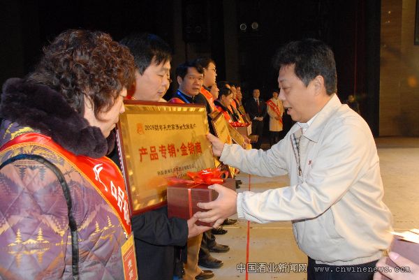 图为中国酒类流通协会副会长、秘书长刘员为孔府家优秀经销商颁发荣誉证书及奖牌。