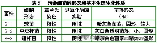 对污染细菌B-1、B-2、B-3的菌落形态、显微形态、革兰氏染色特性及过氧化氢酶反应进行测定,结果见表5和图1。
