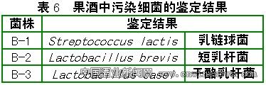 运用16S rDNA序列分析进行分子鉴定,结果见表6。鉴定结果显示,果酒中的污染细菌为产乳酸细菌,是酿造环境中的常见污染菌。