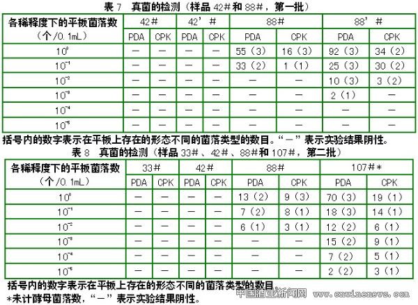 用土豆培养基和察氏培养基进行真菌的分离培养,在培养基中添加链霉素抑制细菌生长,同时添加去氧胆酸钠抑制菌落的蔓延,以便于分离和计数,检测结果见表7、表8。