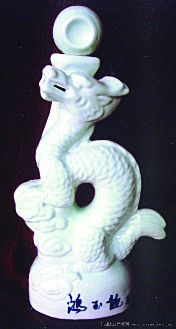 龙体下面的基座正面,烧制有蓝色的“鸿玉龙皇酒”酒名,前三个字为草书,后两字为正楷。基座背后中间是标徽,两侧是“世界名酒”“华夏密藏”八个楷体字。瓶底款两排字为酿酒和制瓶单位:上排是“中国鸿玉龙生物酿造有限公司”,下排是“景德镇市陶瓷研究所”。这些标识既是宣传广告,也是一种负责的表现。