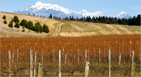 Tapuae-o-Uenuku, the highest peak in the northeast of New Zealand’s South Island, rises above a vineyard in the Marlborough region.