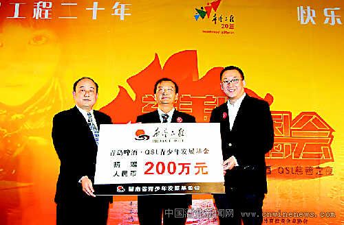 近日,在“希望工程二十年,快乐感恩一辈子”为主题的湖南希望工程20周年答谢晚宴上,青岛啤酒·QSL青少年体育发展基金代表——青岛啤酒股份有限公司总裁孙明波和QSl青少年体育发展基金董事长黄健华捐赠人民币200万元,用于在湖南援建希望小学和捐建希望工程快乐体育园地,以推动当地希望工程“快乐升级”。