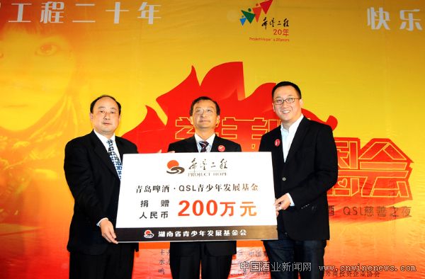近日,在“希望工程二十年,快乐感恩一辈子”为主题的湖南希望工程二十周年答谢晚宴上,青岛啤酒·QSL青少年体育发展基金的代表——青岛啤酒公司总裁孙明波先生和QSl青少年体育发展基金董事长黄健华先生捐赠人民币200万元,用于在湖南援建希望小学和捐建希望工程快乐体育园地,以推动当地希望工程“快乐升级”。