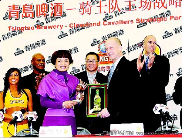 美国克里夫兰当地时间12月14日,青岛啤酒股份有限公司与NBA骑士队在骑士队主场美国克利夫兰速贷球馆举行了签约仪式,正式达成了为期5年的战略合作协议。根据协议内容,青岛啤酒将成为骑士队主场大中华区官方合作伙伴,享有青岛啤酒——骑士队主场大中华区官方合作伙伴冠名称谓使用权,以及骑士队速贷球馆的形象使用权和部分场地使用权等;除了一系列的商业广告合作之外,还包括对中国贫困地区的体育设施进行援助的慈善推广合作。青岛啤酒股份有限公司营销总裁严旭和
