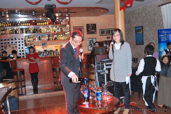 文章来源华夏酒报 12月15日晚,号码百事通网站电信积分商城圣诞酒会在江苏南京举行,作为其合作单位的江苏圣果葡萄酒业有限公司则提供了精美的酒会用酒。图为圣果公司副总经理、首席酿酒师佐藤知巳先生和其日语翻译杨静在为现场的嘉宾讲解葡萄酒的品鉴方法。