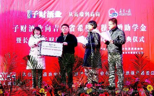 据了解,长春市子财酒业有限公司主营五粮液、百威、轩尼诗、芝华士等国内外名优酒。公司董事长魏勇多年来一直热衷于公益事业,此次爱心行动,子财酒业先期向吉林省青少年基金会捐款5万元,专门设立“子财希望工程基金”。同时,该公司承诺今后每销售出1瓶酒,将从中拿出2元钱捐给吉林省青少年基金会,充实“子财希望工程基金”,帮助更多的贫困学子。