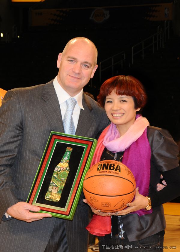 青啤公司营销总裁严旭和NBA湖人队副总裁及首席推广官Tim Harris互赠礼物