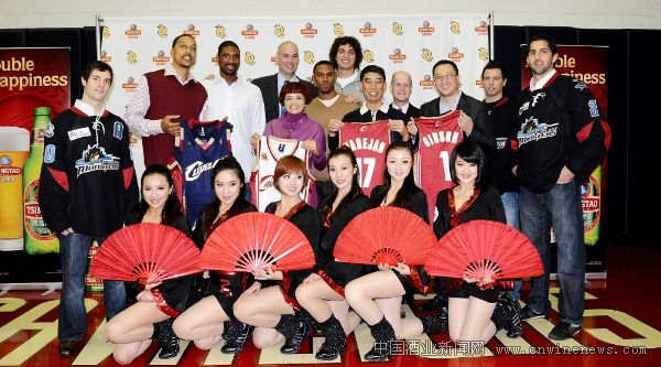 北京时间12月15日,青岛啤酒股份有限公司与NBA骑士队在骑士队主场美国克利夫兰速贷球馆举行了签约仪式,正式达成了为期五年的战略合作协议。青岛啤酒股份有限公司营销总裁严旭和骑士队总裁Len Komoroski现场签约,青岛啤酒股份有限公司副总裁孙玉国、NBA骑士队总经理Danny Ferry 、NBA骑士队华人老板黄健华、全国政协常委洪祖杭、NBA骑士队著名球星瓦莱乔(Anderson Varejao)、吉布森(Daniel Gibson)、穆恩(Jamario Moon) 和鲍维(Leon Powe) 现场见证。同时,青岛啤酒“炫舞激情”NBA啦啦队选拔赛总决赛冠军的六名选手也进行了首场“美国秀”。