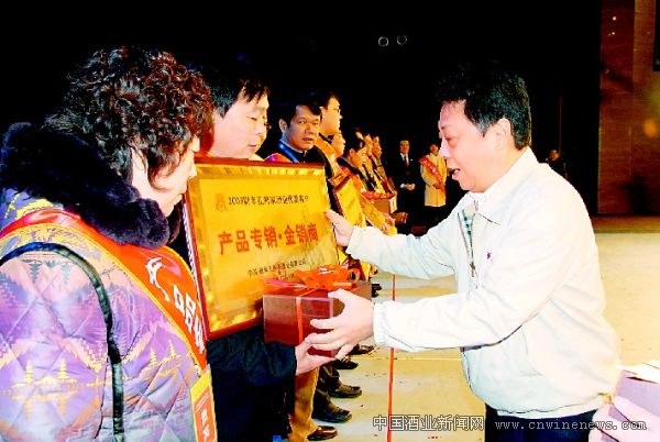 图为刘员为孔府家优秀经销商颁发荣誉证书及奖牌。