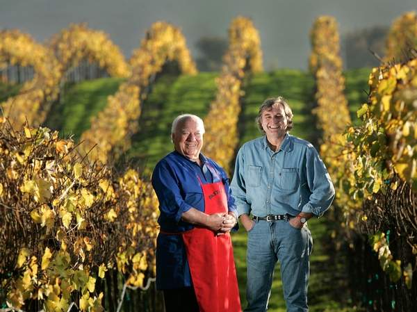 JOHN BURGESS/The Press Democrat Sonoma County's "Pasta King'' Art Ibleto, shown here in 2008 in his Cotati vineyard with partner Chris O'Neill, right, has pulled out of plans to buy the former Topolos winery in Forestville.