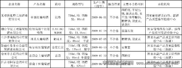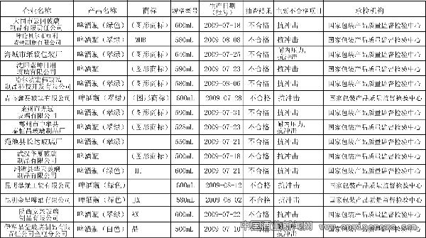 1月5日,国家质量监督检验检疫总局发布了2010年第4号公告《2009年第3批产品质量国家监督抽查质量公告》,对抽查结果予以公布。其中包含葡萄酒产品质量和啤酒瓶产品质量国家监督抽查结果。抽查结果显示,6家企业生产的6种葡萄酒检验不合格,15种啤酒瓶产品达不到国家标准规定的要求,其中12种产品抗冲击不合格,3种产品抗冲击和耐内压力不合格。(不合格名单见下表)具体内容详见中国酒业新闻网(