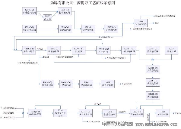 中药作为一种复杂体系,受到品种、产地、采收时间等多因素的影响,很难保证中药及中药制剂的质量稳定性。劲牌公司在多年中草药加工的基础上,结合现代管理理念,提出了小批量多品种生产方式,依靠多品种多单元组合的多流程过程适应不同品种药品的生产。下图为工艺流程图。
