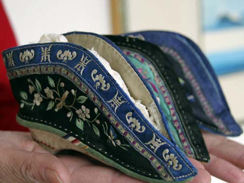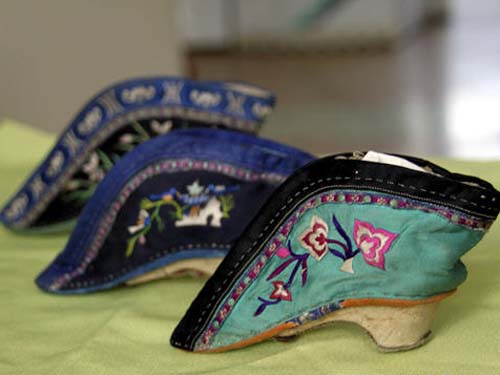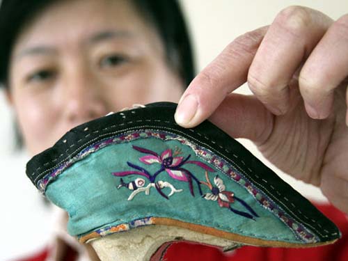 Ma Shujun, a citizen of Chifeng City in Inner Mongolia, is displaying her collection of a 'sancunjinlian' shoe made in the Qing Dyansty, January 14, 2010. She keeps three such shoes in her house with the shortest one measuring 9.9cm and the longest one less than 13cm, and the vamps are made of either silk or common cloth.