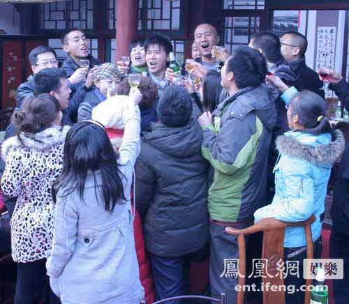 胡军、伍思凯和群众演员豪饮(图片来源:凤凰网娱乐)