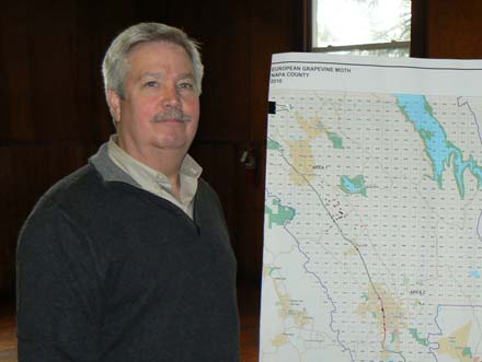 Napa County ag commissioner Dave Whitmer consults a map displaying locations where the European grapevine moth has been detected.