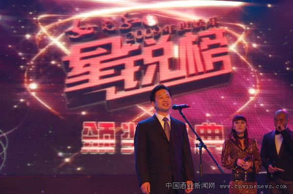 济南女儿红白酒销售有限公司董事长林祥超为“女儿红白酒2009年度娱乐星锐榜”获奖艺人颁发奖杯。