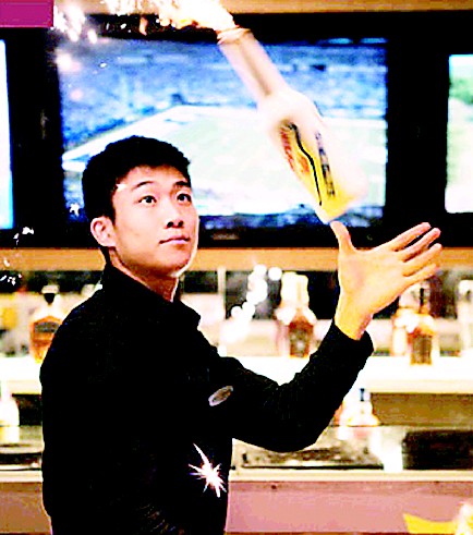 调酒师李陈志的调酒表演仅在周五周六两天晚上提供,穿插在赛事休息时段——他最拿手的当属烟花调酒表演。当两个点上了烟花的酒瓶开始在他手中及身前身后忽上忽下挥洒自如的时候,你都不敢相信,他真的娴熟到了一点出错的机会都没有。有人说学调酒的都有那么点当杂技演员的天赋,看来果真如此。烟花调酒可以打造出所有的鸡尾酒。和搭档 Jason 合作亦可打造出双人花式调酒,每次都赢来不少掌声。