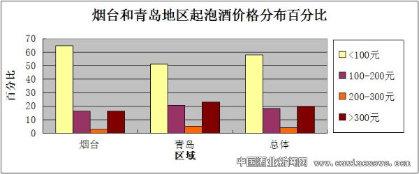 调查发现,烟台市和青岛市市场上的起泡葡萄酒,威龙市场占有率较高,价位主要为20元—40元之间,另有少量的小品牌,如白洋河等。高价位起泡葡萄酒几乎没有。而进口的起泡葡萄酒的价位主要集中在百元左右,高档起泡酒和香槟约占调查所得样品总数的20%左右,而价位在200元—300元之间的起泡葡萄酒仅仅占约5%左右(见上图)。对比青岛和烟台两地的调查结果发现,烟台市高价位的起泡酒(>300元)约占起泡酒的15%,而青岛市大约占到25%。