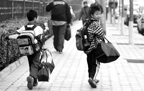 Two primary school students walk on the streets of Beijing, carrying heavy loads for extra classes after school.