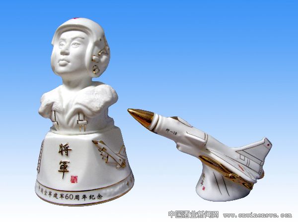 “将军”酒的酒瓶是一尊空军飞行员半身塑像,以形写神,简洁明朗,飞行员目视远方,神情严肃庄重。酒瓶由广东乐祺陶瓷厂烧制,乐祺陶瓷产于广东枫溪窑口。酒瓶的胎质精细,瓷土采用当地优质的高白泥,施以高白釉,纯白洁净。飞行员的脸面、脖颈和飞行服的毛领处未施釉料,以此表现人物的神韵和毛绒的质感。盛酒的瓶体为棱台形,成五面,正面是酒名,下方有“中国空军建军60周年纪念”字样,另外四面浮雕描金,为战斗机、雷达