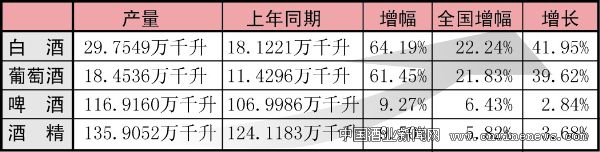 统计数据显示,2009年1月—11月,吉林省实现白酒产量29.7549万千升,比上年同期的18.1221万千升增长了64.19%,增幅比全国的22.24%高出41.95%;实现葡萄酒产量18.4536万千升,比上年同期的11.4296万千升增长了61.45%,增幅比全国的21.83%高出39.62%;实现啤酒产量116.9160万千升,比上年同期的106.9986万千升增长了9.27%,增幅比全国的6.43%高出2.84%;实现酒精产量135.9052万千升,比上年同期的124.1183万千升增长了9.50%,增幅比全国的5.82%高出3.68%。
