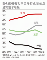 在产品布局上,与进口葡萄酒开始出击中档酒市场截然相反的是,国产葡萄酒品牌在高档酒上全面发力,抢占国产高端葡萄酒的空地。张裕最早在行业内完成了“4+1”的中高端产品布局,长城紧随其后推出了高端的“君顶酒庄”和“桑干酒庄”。2009年上半年,尽管张裕推出了6款价位在18-32元的中低档葡萄酒,但其发展重心仍为中高端产品解百纳和酒庄酒。光大证券的研究报告指出,2007年下半年推出的爱斐堡,32万元/吨的平均出厂价比卡斯特系列高出30%以上,虽然仍处于市场培育期,但2009年前三季度的销量增速已经超过200%,而另一个同处培育期的黄金冰酒同期增速也超过了40%。事实上,从2006年到2008年,解百纳和酒庄酒占张裕葡萄酒收入的比重分别提高了2.4和7.8个百分点,中高端产品的增速明显高于低端产品,比重不断提高(图3)。与之相伴的,则是中高端产品结构优化所助长的盈利能力增强。在近几年行业总体毛利率水平波动并有所下滑的大背景下,张裕的毛利率水平在2004-2008 年上升了6.8个百分点至70%。即使是在2009 年上半年,毛利率也实现了0.1个百分点的微幅增长,而到了2009 年第三季度,则大幅上升4.6个百分点,达到70.2%(图4)。