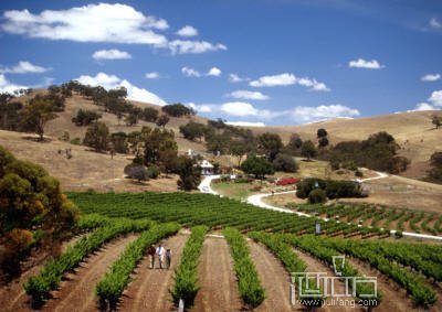 清晨,我们第一站是阿得莱得最安静和迷人的BAROSSA山谷。这个山谷最早因为19世纪初一些被苏联人驱逐出德国的德国人在这里种植葡萄和酿造葡萄酒而被发现,到现在仍然是澳大利亚出产葡萄酒最有名的地区。不同的是,澳大利亚人已经将葡萄酒的酿造技术完全的掌握并加以改良,所以现在BAROSSA出品的葡萄酒已经可以和法国葡萄酒媲美。