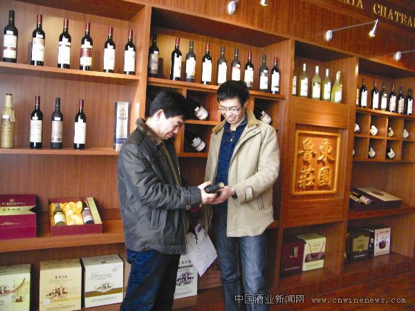 有限公司加大市场开拓力度,将华南、华东等沿海城市作为主攻市场,取得了很好的市场业绩,2010年初,广东的一个老客户前来企业参观,就进一步深度挖掘华南市场进行交流和研究。图为鲁东华夏庄园葡萄酒有限公司总经理胡佰韬向客户介绍产品。