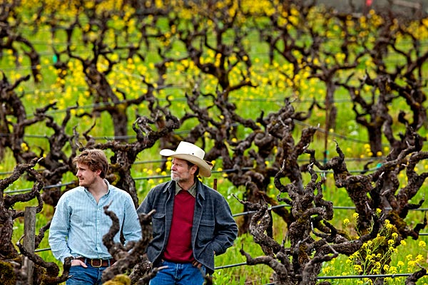 Morgan Twain-Peterson, left, makes a Bedrock Heirloom Wine that's half Zin. His dad, Joel Peterson, makes a Ravenswood wine labeled Zinfandel. (Robert Durell / For The Times)