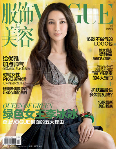Chinese film actress Li Bingbing appears on the cover of the latest issue of Vogue China. Named as the Queen of Green, 'Snow Flower and the Secret Fan' co-star looks so graceful and dignified. [Photo: Vogue/sohu.com]