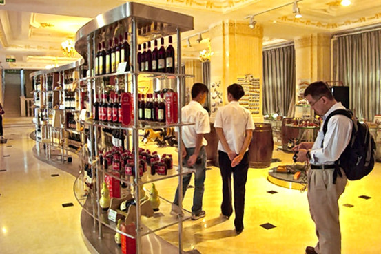 To satisfy Chinese wine drinkers' growing sophistication, the large Shanghai First Food Store on Nanjing Road East walking street now has a separate wine room filled with high-end products from the Big Three displayed alongside French wines. Some wines are clearly aimed at the gift market. Great Wall sells a $72 red wine in an individual wooden case with a glass cover that slides open to reveal the wine, resting on a bed of straw, with the label showing nothing more than a painting of a vineyard. A potential buyer would have to open the case and twist the bottle around to learn that it's a 1998 Cabernet Sauvignon.