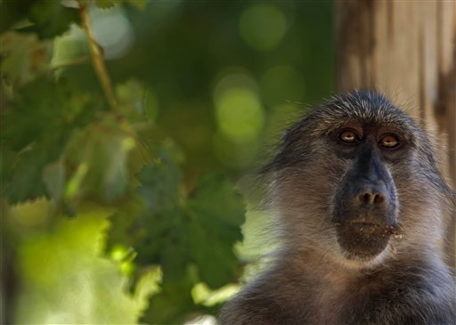 In this photo taken Friday, March 19, 2010, a Baboon look fore grapes at a vineyard on the Constantia Uitsig wine estate situated on the outskirts of Cape Town, South Africa. Baboons are already accused of car-jacking Cape Town tourists in search of food. Winemakers say the rampaging troops of primates are also munching their fill of premium grapes in the region's famous Winelands area. (AP Photo/Schalk van Zuydam)