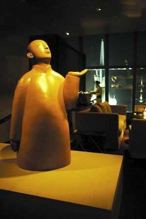 在找到上楼的电梯前,季裕堂起码还卖了三个关子。我穿过了高达16米的大门,仿佛走进一个殿堂,转过了三个弯后,才到明亮的电梯间。墙壁内侧上挂着三个满脸堆笑、躬身相迎的雕塑小人,熟悉中国当代艺术的人会知道这是高孝午的系列作品《标准时代》之一。雕塑人物脸上标准化的微笑是艺术家对标准化世界的一种讽刺和调侃,上海柏悦把它安置在迎宾处,似乎是标榜精品酒店自身的独一无二。