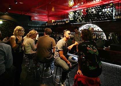 TRACES OF ITS FORMER LIFE remain at LL Wine and Dine. From outside, everything looks innocent enough. Even when you step inside the narrow, warm, dimly lit room with a glimmering bar on one side and super-skinny bar tables along the other, everything seems perfectly fine. Walk out the back towards the bathrooms, however, and there are two conspicuous rooms, one above and one below, shrouded in tangled walls and twisting staircases. I wonder what used to go on back here. A wall adorned with vintage porn posters provides some clues.