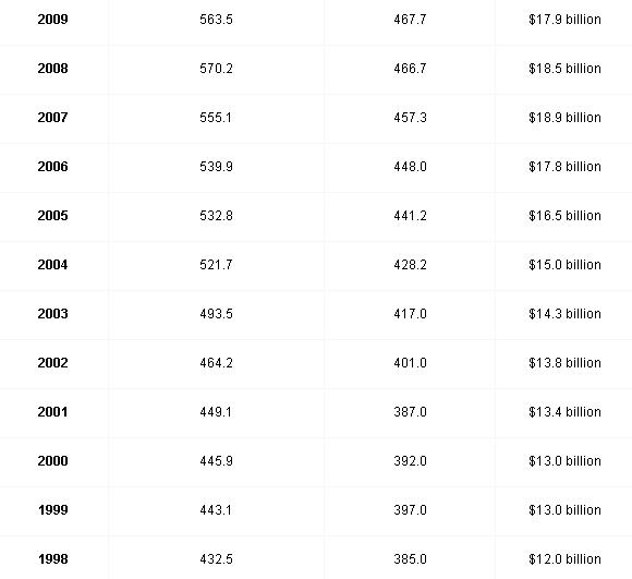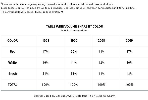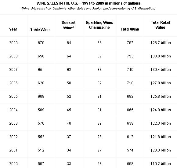 Wine sales to the U.S. from all production sources—California, other states and foreign producers—grew 2% to 767.4 million gallons (322.8 million cases) in 2009, according to Gomberg-Fredrikson. Estimated retail value fell 4% to $28.7 billion. Table wine volume accounted for 670 million gallons, dessert wine 64 million gallons, and sparkling/champagne 33 million gallons. The 467.7 million gallons of California wine shipped to the U.S. represented a 61% share of the U.S. wine market.