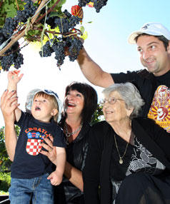 Matriarch of the family Vesna Milicich is celebrating her 70th year at the Ohaupo property and looked on proudly as two-year-old great-grandson Niko Nooyen helped pick the grapes... and eat a few.