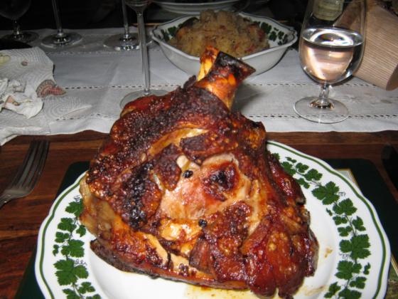 Dinner at Andy and Claudia’s last night: one pork knuckle almost as big as a suckling pig per person with potatoes and sauerkraut and a Château Mouton ’81 in excellent nick. Miraculous 11.5% alcohol, still fresh and elegant with layers of complexity but hardly any sediment in the bottle. We next opened Michael’s Kanonkop Paul Sauer 1997 and the 14% alcohol really showed up against the Mouton. Andy supplied a 2001 Paul Sauer, also 14% alcohol and full of intense berry fruit.