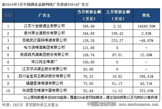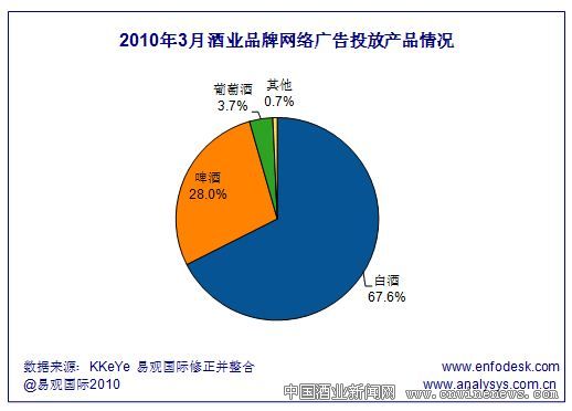根据易观国际Enfodesk产业数据库研究显示,2010年3月,酒业品牌网络广告投放规模出现大幅下跌,与2月份相比环比下降66.2%。