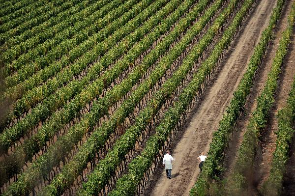 Photo taken on April 12 shows two sommeliers visit a vineyard near Santiago, capital of Chile.