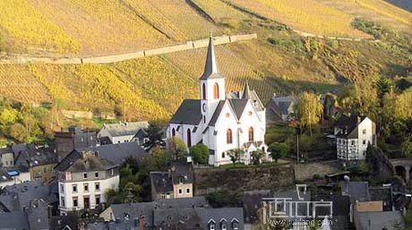 这里红酒喝的差不多了,紧接着要去的是特里巴-特里巴赫一家白葡萄酒厂,翻译介绍说这里有刚刚酿好的白葡萄酒,典型的德国白葡萄酒的风格。顺着一个小山坡上去,一边是葡萄园,一边是美丽的小城。葡萄园已经要过冬了,色彩呈现的五彩斑斓,在整齐的划出一道道优美线条的低矮葡萄架上,跃动着红黄绿的鲜艳色彩,让这个安静的地方增加了灵动的美感。另一边是两山夹起来并缓缓延伸到一片开阔地的小城,在小城的中间是静静地闪着粼光的莫索尔河,阳光的照射给它披上了金色的光晕。