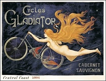 This image provided by Thomas Jefferson Center for the Protection of Free Expression shows a wine label for Cycles Gladiator produced by Hahn Family Wines. The Alabama Alcohol Beverage Control Board won its Muzzle for banning the sale and distribution of a California wine because it displays "a person posed in an immoral or sensuous manner." The image in question is a replica of a 1895 French poster featuring a nymph flying next to a winged bicycle. (AP Photo/Thomas Jefferson Center for the Protection of Free Expression) (AP)