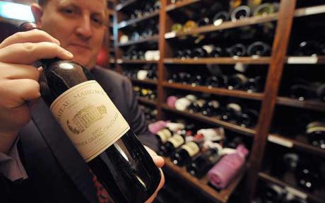 Stephen Wickens, of Crown Wine Cellars, holds up a bottle of Chateau Margaux Bordeaux 1989 Photo: AFP/Getty Images