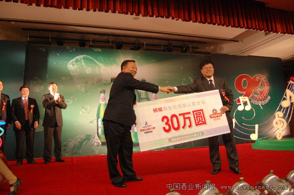 在新闻发布会现场,曲继光总经理代表日本朝日公司、青岛啤酒公司和烟台啤酒集团三方,向烟台市残联捐赠现金三十万元,用于爱心助殘事业。