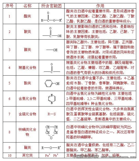 (2)根据微量成分所包含的官能团不同,可将酒中微量成分分为10大类,见表1: