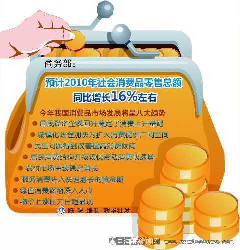 报告预测,2010年消费品市场将继续保持平稳较快增长,预计全年社会消费品零售总额将同比增长16%左右。
