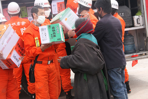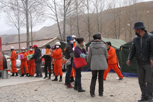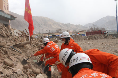 7:30,在两位队长带领下,全体队员携带救援设备来抗震救灾指挥部,坚决请命:“哪里需要,我们就去哪里!”拿到玉树县抗震救灾指挥部调遣的纸条后,救援队一路问询赶到玉树县指挥部,向玉树县县长才仁公保表明了决心。急迫心情的驱使下,队员们开始主动找寻需要清理的废墟和需要帮助的同胞。